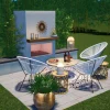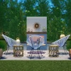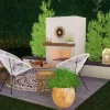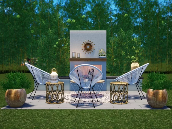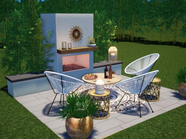 The Avalon Fireplace is a cozy outdoor space with all the feels of a living room. The fireplace has every element that a fireplace should…hearth, mantle, and warmth. Three rope chairs envelop you as you gaze into the flames, and there is plenty of extra seating on the hearth if unexpected guests show. Planting behind the fireplace is a screen for privacy as well as ambience. Lanterns, a rug, and potted plants are the final touch for your new favorite place.