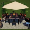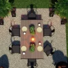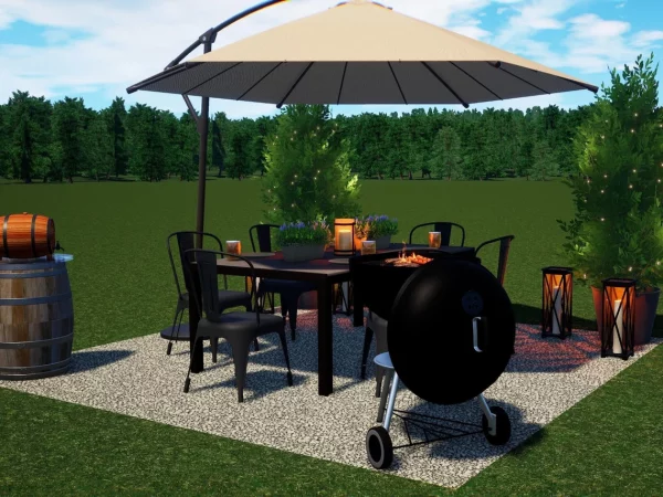 Get that casual, outdoorsy feeling you are looking for with Cobblestone Dining. Implement this plan into any 12×12 space – your existing hardscape, bare earth, or any other surface. With seating for six, there is ample room here for dining, cooking, and simply hanging out with friends. A quaint wine barrel punctuates the corner, and can be used as an extra table, or a place to put your drinks for the night. Complete your meal on the portable charcoal grill, all under the shade of the cantilever umbrella.