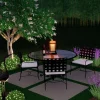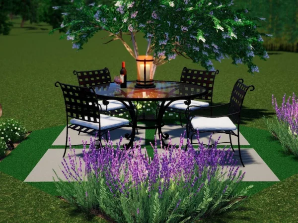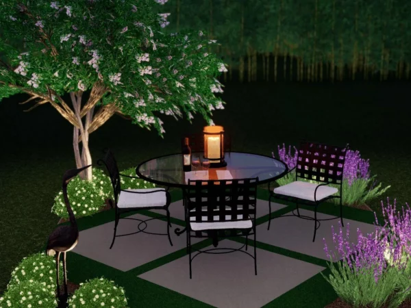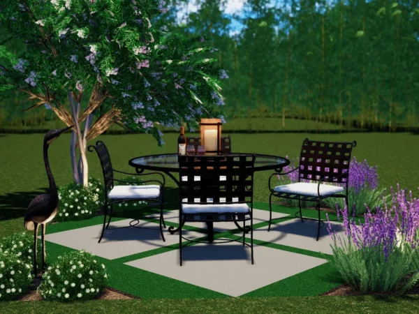 The Entropa Dining patio is a quaint 12×12 space, that is designed to provide function, shade, greenery, and a little bit of culture. Four 4’x4’ concrete pads are easy to install, and artificial turf in between allows for furniture and maximum functionality. An ornamental tree in one corner provides shade, and small pockets of greenery in other corners will contribute to the “outdoor room” feel with a colorful border. Lastly, punctuate the edge by adding a whimsical crane statue, uplit for extended enjoyment.