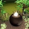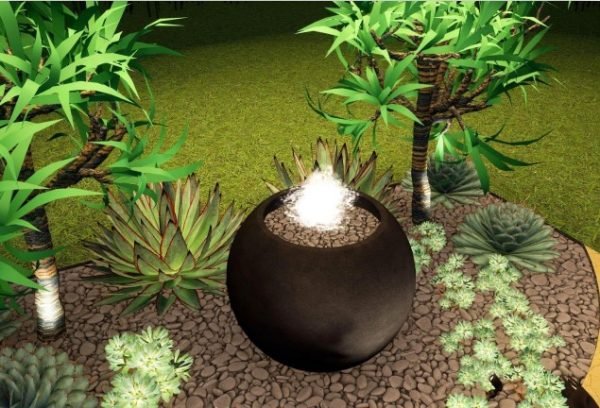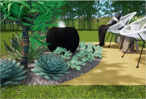 The Joshua Tree Fountain is a Boho style setting, with simple yet bold colors and textures. The fountain sphere is set upon a pondless reservoir that is submerged under a bed of natural rock, eliminating any worry of danger. The wonderful audio of running water is always soothing, and this showpiece will be doing double duty as your focal point! Outdoor rope chairs provide comfortable seating for two, and the backdrop is filled with greenery.