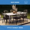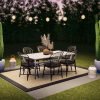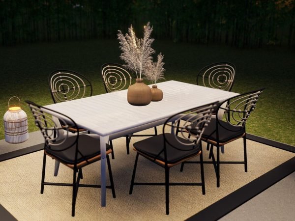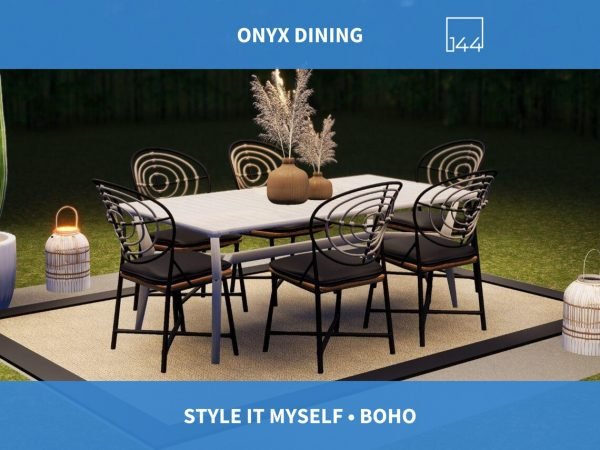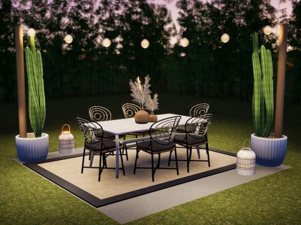 The Onyx Dining Plan is the perfectly easy solution to your Alfresco dining needs! A large outdoor rug will cover your existing hardscape, bare earth, or other surface, and give it an “Outdoor room” feel. A Dining set fit for six goes perfectly in this space, and is flanked by pots to showcase some statuesque greenery. Boho-style lanterns and Market Lights complete the setting!