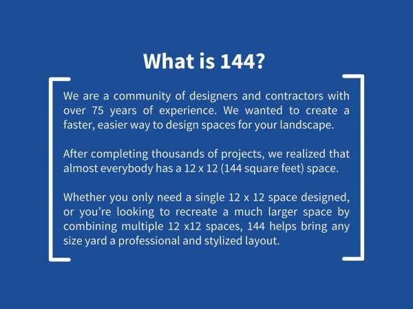 We are a community of designers and contractors with over 75 years of experience. We wanted to create a faster, easier way to design spaces for your landscape. After completing thousands of projects, we realized that almost everybody has a 12 x 12 (144 square feet) space.