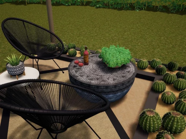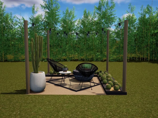 Onyx Lounge is the perfect place to relax after a long day’s work. There is ample space for two or more Boho style oval chairs, and a significant coffee table for either cocktails or a full meal. The planter edge separates the space from any surrounding areas, you can leave the main living space as bare earth, or install the decomposed granite, details included. Regardless of the surface, an area rug gives it that “outdoor room” feel. Posts with market lights provide ideal ambient lighting.
