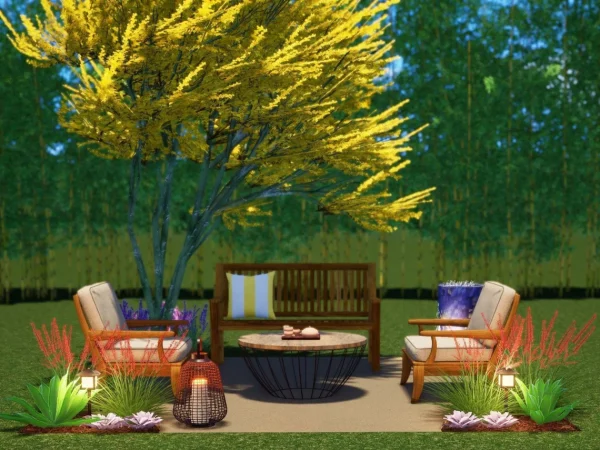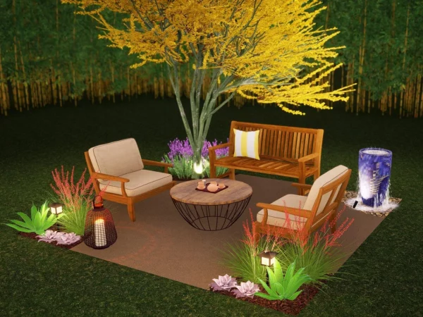 Palo Verde Garden has all the natural feels. With seating for at least 4, it’s a great place to relax after a long day of work or on a lazy sunday. Two oversized lounge chairs have cushions, and a matching bench sits adjacent. A canopy tree provides shade and structure to one corner, while a whimsical fountain bubbles in the opposite corner. Greenery fills in the other spaces, and this whole project can be done in a weekend!