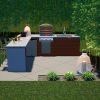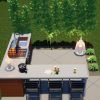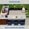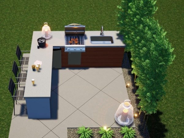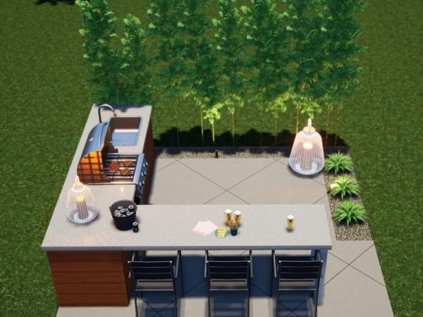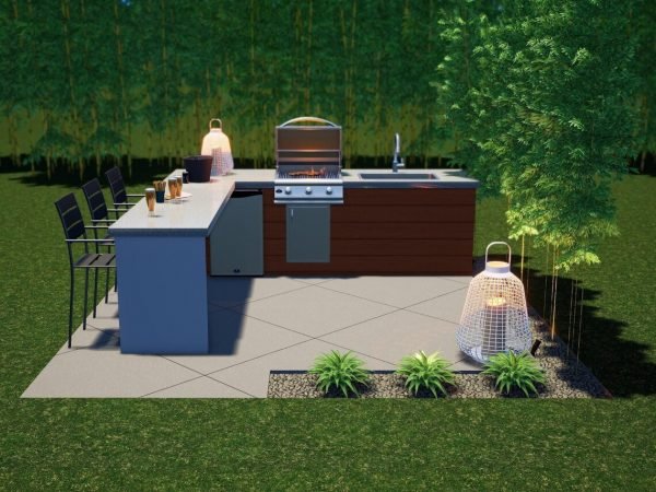 The Ponderosa BBQ is a simple, symmetrical design that offers maximum functionality and a classy atmosphere. The “L” shaped BBQ structure gives a generous amount of workspace and also maximizes the opposite side for dining. The “hollow bar” is an excellent way of providing seating for your guests, but does not make this cozy space seem too obstructed. Materials are simply modern and clean, and just the right amount of greenery and lighting complete the setting.