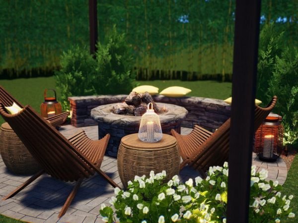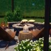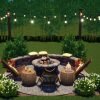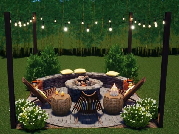 Enter Sierra Fire Pit and transform yourself into a different world. You won’t believe how this small space can feel so functional. The firepit is the center of it all, stone clad and warm. A matching planter wall brings greenery and shelter from breezes, while doubling as extra seating. The three main adirondack chairs allow for relaxing, reading, or even working while enjoying the fire. Overhead market lights are the final touch, providing the perfect ambient lighting.